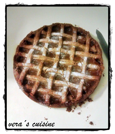 - Zo zvyšného vyvaľkaného cesta (z chladničky) nakrájame rovnako hrubé pásiky, alebo iný ornament. Džem natrieme na koláč a pásiky naukladáme v rovnomerných rozostupoch.
