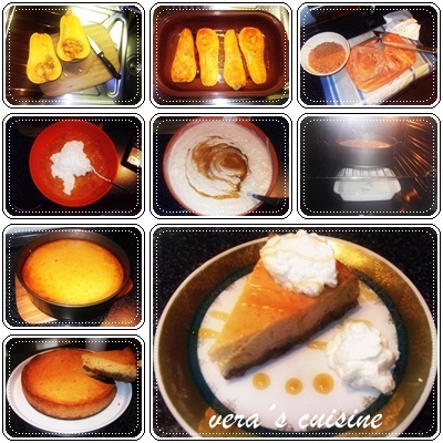 Pôvodne som chcela urobiť nejaký dobrý tradičný Pumpkin pie, ale nakoľko som na stránkach našla pies iba z tekvicového pyré z plechovky, naštvala som sa a prišla som so svojím receptom na cheesecake. Musím sa pochváliť, veľmi sa nám doma kombinácia chutí páčila, je vynikajúci :)